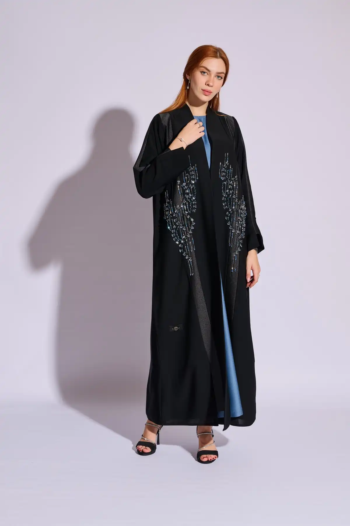 Black abaya with luxurious handwork on the front side or sleeves, with a colorful inner dress matching the Hand work color in the abaya.